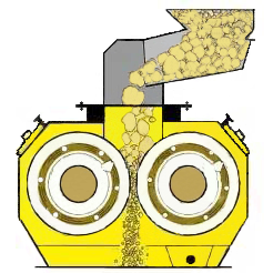 KIS Double roll crushers are used for both, primary and secondary crushing. They guarantee a strictly defined final material size with minimal fines. Roller diameter, tooth form and circumferential speed are adjusted to the type and size of the feeding material in relation to the final material size. In order to facilitate maintenance, the crushing roll shafts are arranged in heavy-duty cast steel housings with lubricated amply dimensioned spherical roller bearings.